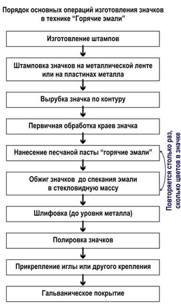 При помощи гальванизации, металлические значки окрашиваются в нужный вам цвет, и на заключительном этапе на значки наносятся цветные эмали.
